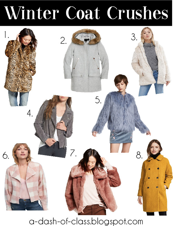Another bonus about this winters statement coat trend, is all of the ways you can wear it. In years past I would've pushed a pink shaggy coat to the back of my closet, saving it for a special occasion. Now that the trend is present I feel like it's totally acceptable to throw it on with a sweater and some jeans and run to the mall. And I don't see us going back form that - its way too fun! I did include some non-furry coats in my coat crushes, because I still love the traditional winter look. The top grey J. Crew jacket would look fabulous for a day out in the snow, or a walk around the local park. The bottom mustard coat I just couldn't resist, I mean I love mustard so much for this season, I wouldn't be surprised if this jacket made it on the blog here soon.